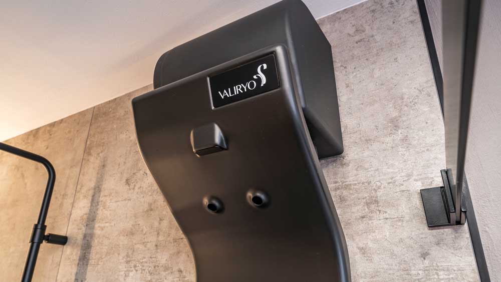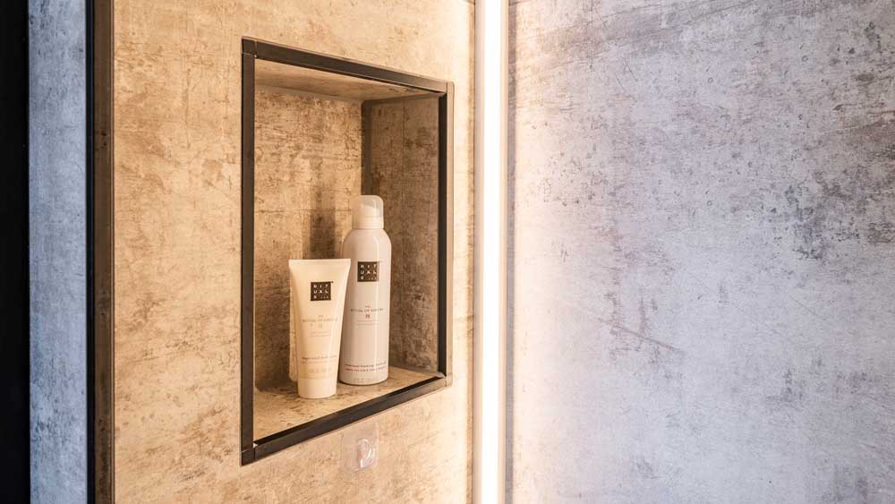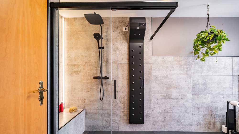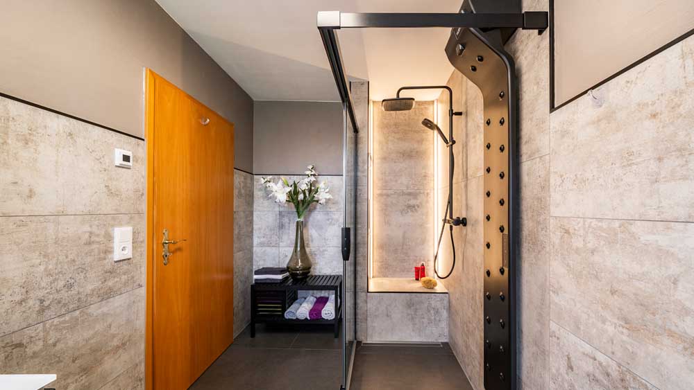 Der fugenlose Duschbereich mit integriertem Sitz sorgt nicht nur für ein großzügiges Raumgefühl, sondern bietet auch besonderen Komfort im Alltag. Lichteffekte in der Dusche schaffen eine angenehme Atmosphäre und setzen den Bereich stimmungsvoll in Szene. Für ein bequemes Trocknen nach dem Duschen ist ein Ganzkörpertrockner in elegantem Schwarz installiert – funktional und zugleich optisch harmonisch.