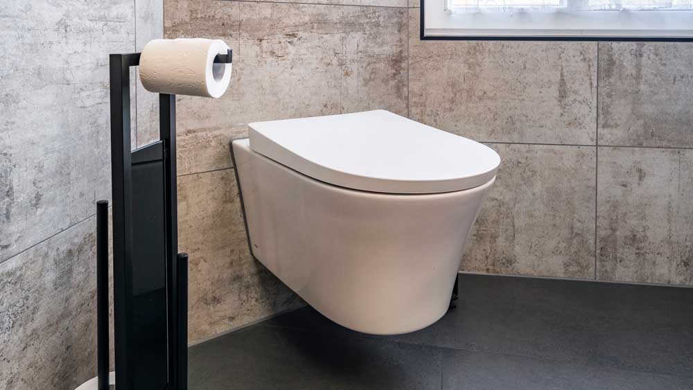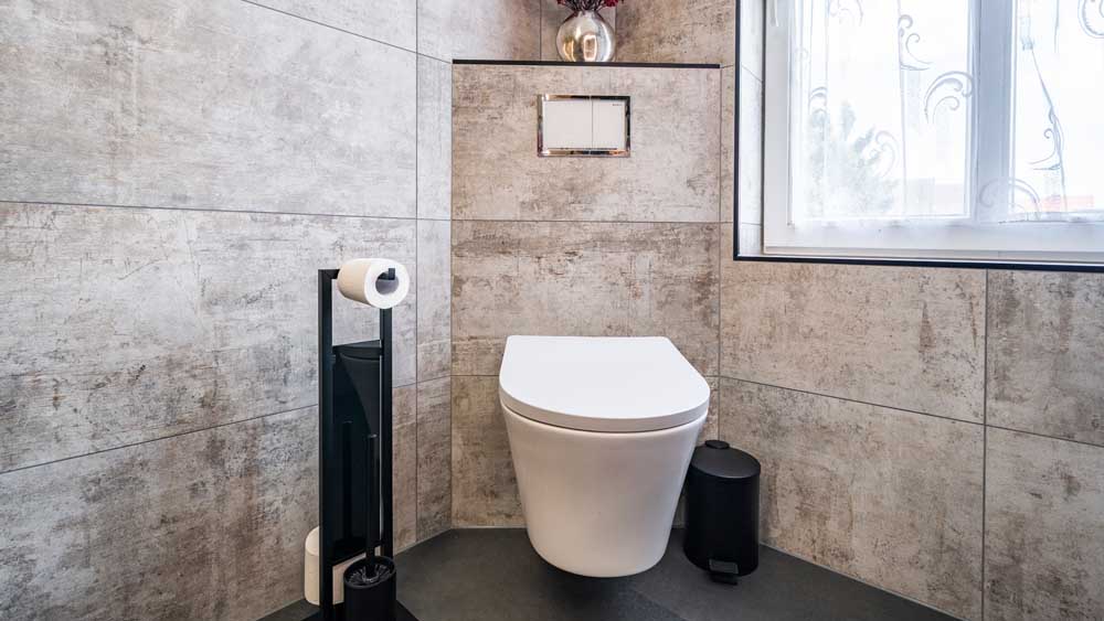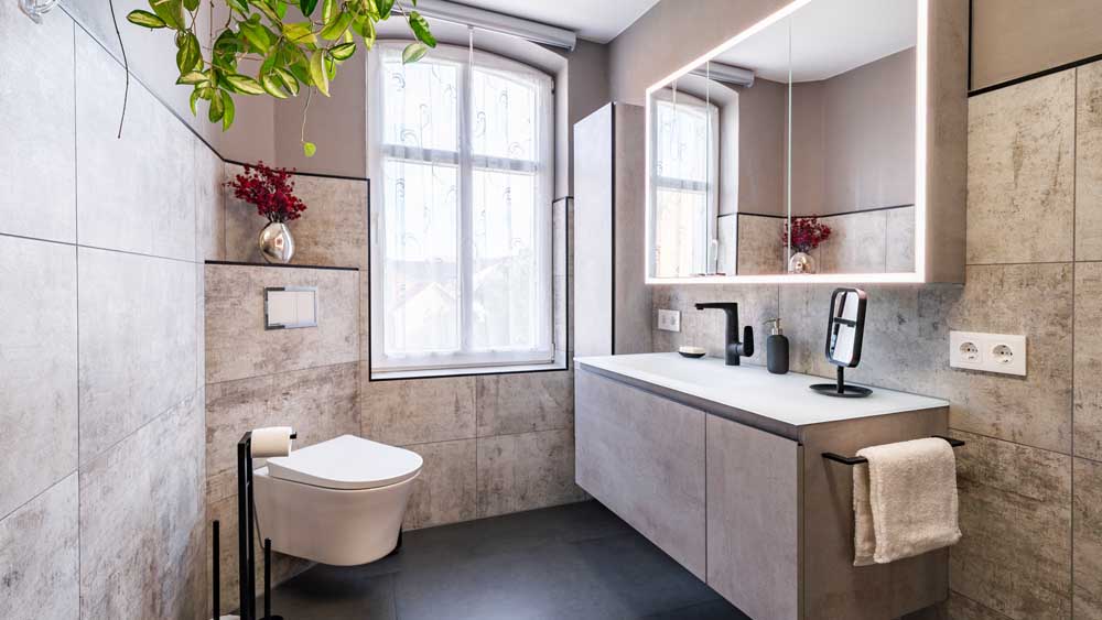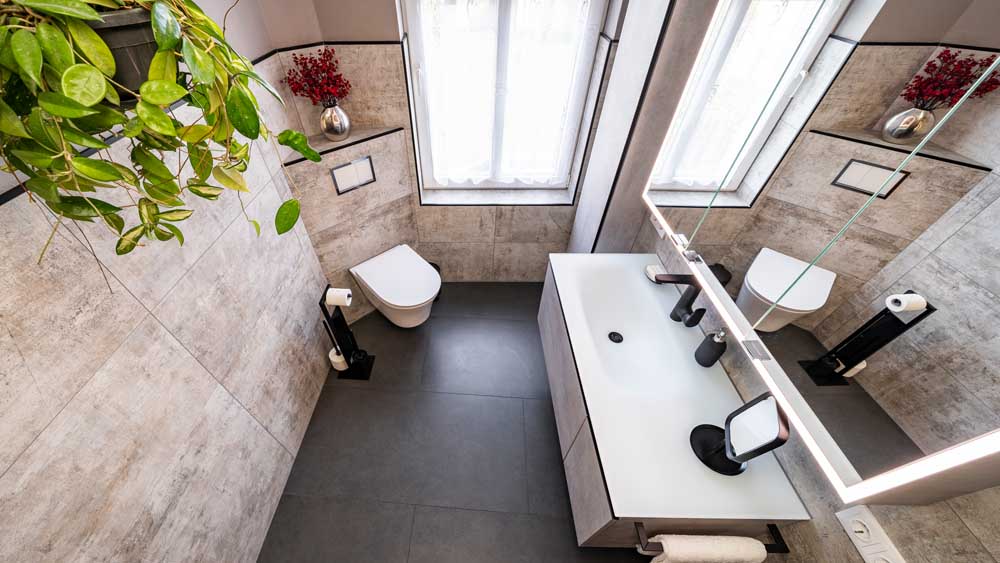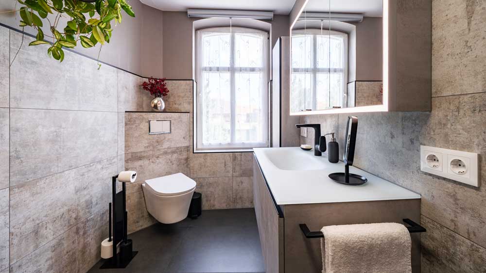 Auch die übrige Ausstattung folgt dem modernen, ruhigen Designkonzept: Schwarze Mischbatterien setzen stilvolle Akzente und bilden einen klaren Kontrast zu den hellen Oberflächen. Die Wände sind halbhoch gefliest, während der obere Bereich fugenlos gespachtelt wurde, was dem Raum eine glatte, zeitgemäße Optik verleiht.