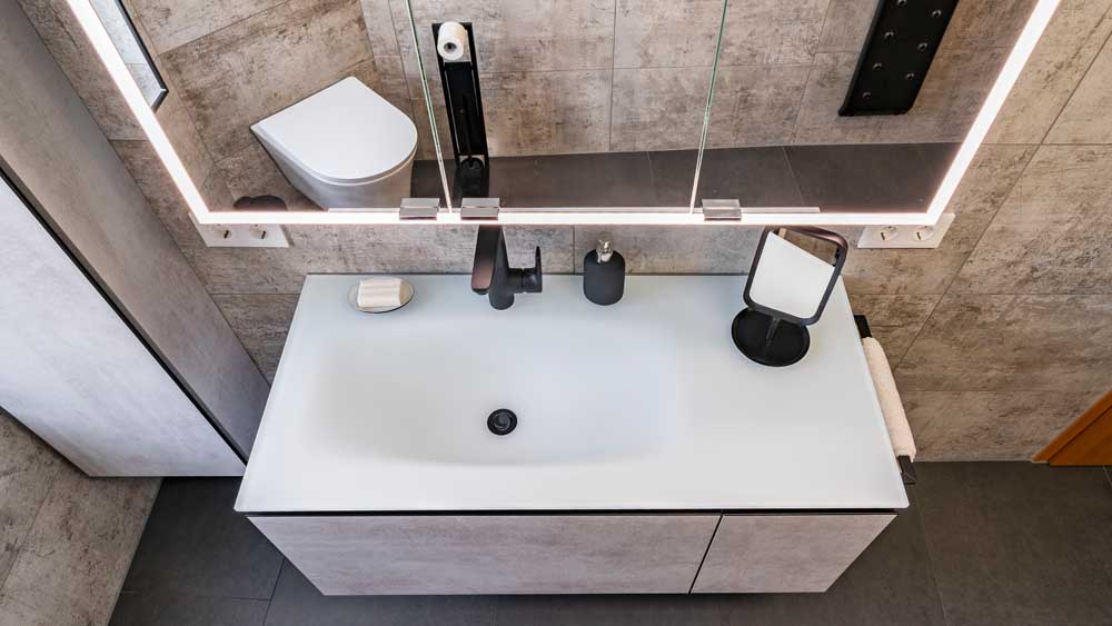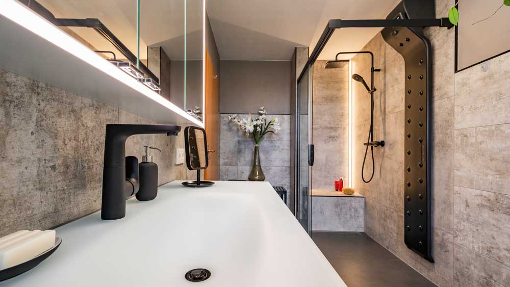 Dieses Bad zeigt, wie sich moderne Technik und ästhetische Klarheit auf kompaktem Raum ideal verbinden lassen.