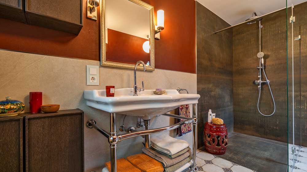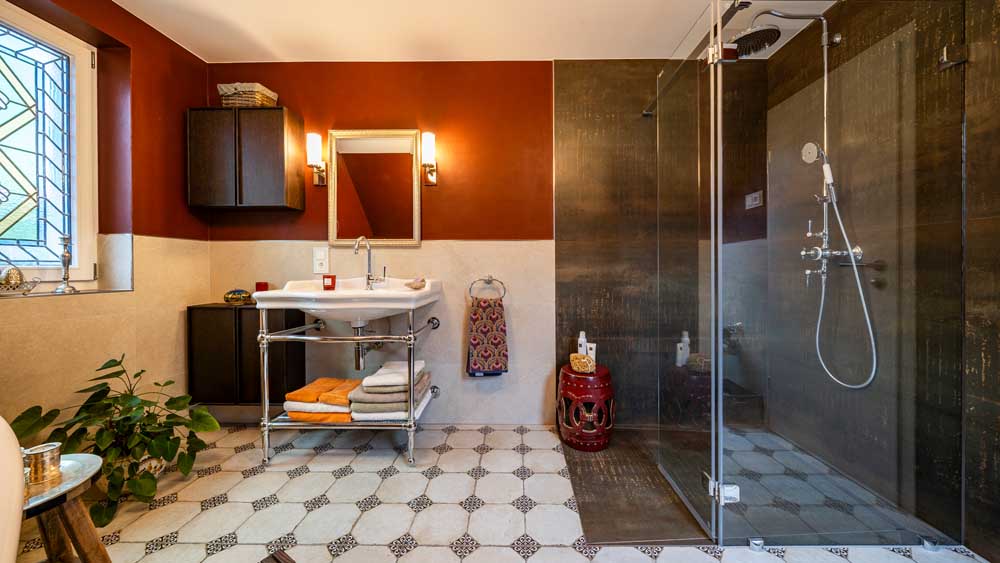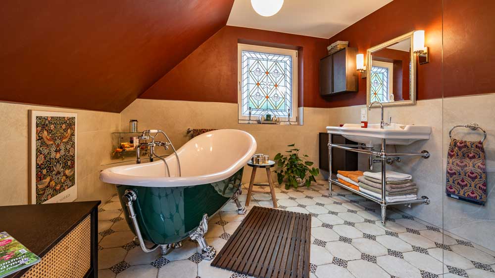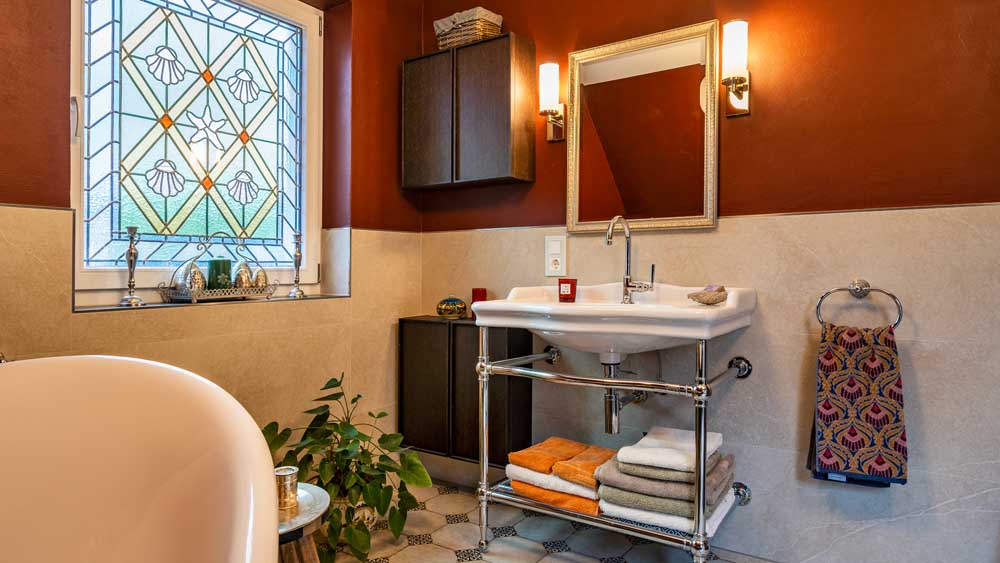 Ein weiteres gestalterisches Schmuckstück ist das Badfenster mit spezieller Bleiverglasung, das dem Raum einen einzigartigen, fast nostalgischen Charakter verleiht. Für zusätzlichen Komfort wurde eine maßgeschneiderte Ablage integriert, die viel Platz für Pflegeprodukte und Dekoration bietet. Der spezielle Waschtisch mit Auflage fügt sich harmonisch in das Gesamtbild ein und unterstreicht das hochwertige Design.