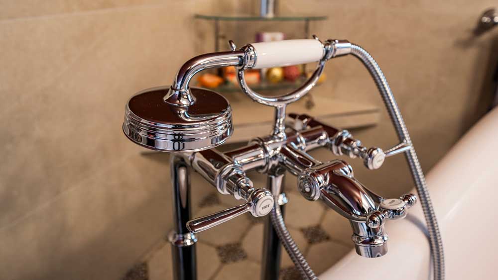 Das Highlight des Bades ist die freistehende Badewanne mit dekorativen Löwenfüßen, die sofort den Blick auf sich zieht und eine klassische, elegante Atmosphäre schafft. Die fugenlosen Duschwände sorgen hingegen für eine moderne, ruhige Optik und erleichtern zugleich die Reinigung.