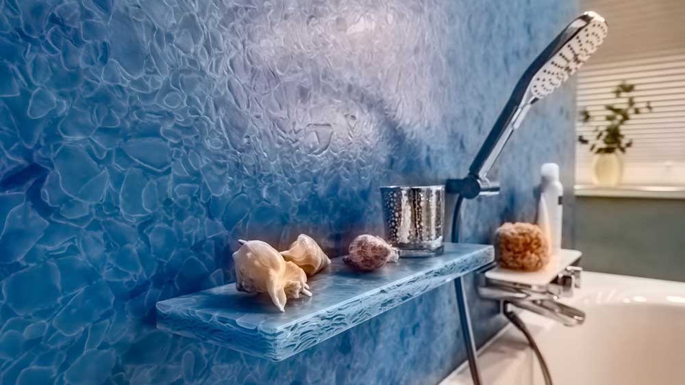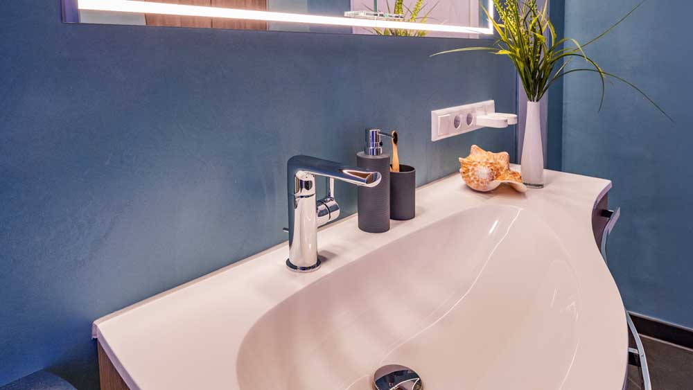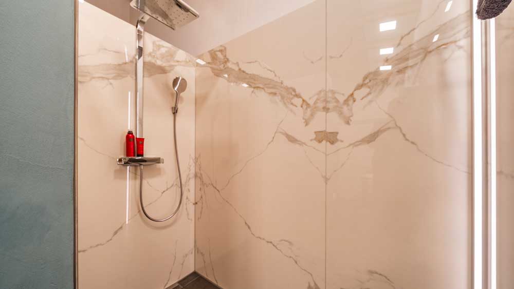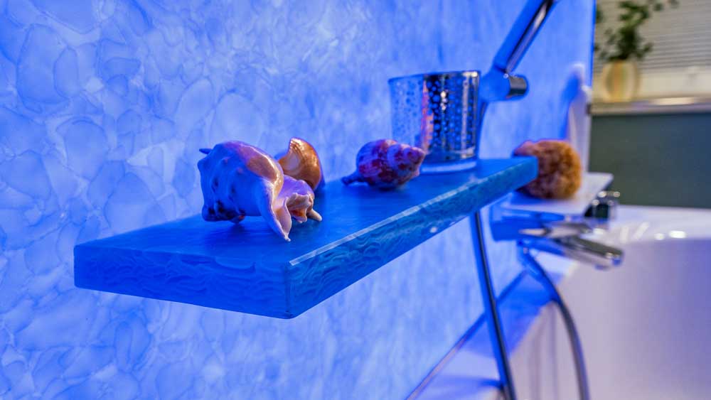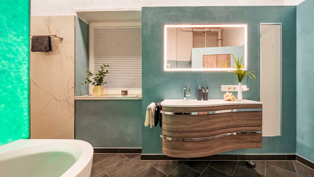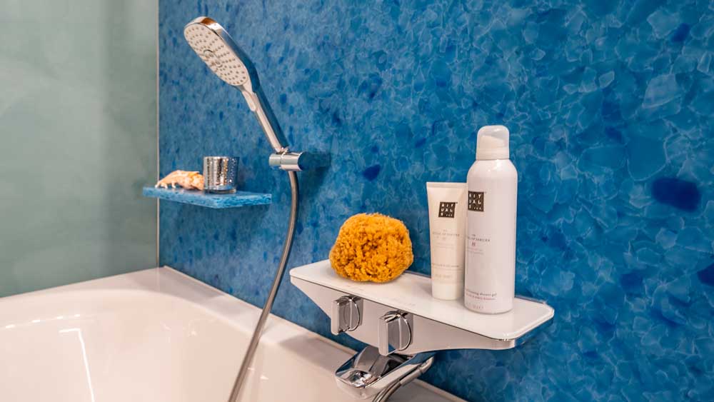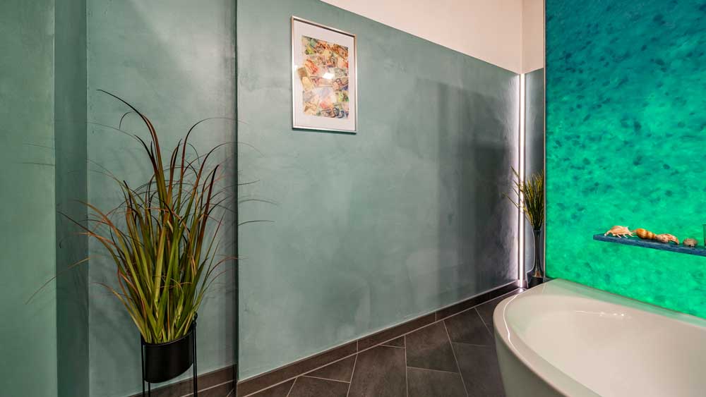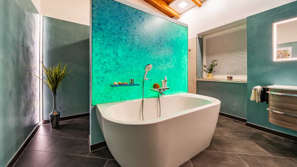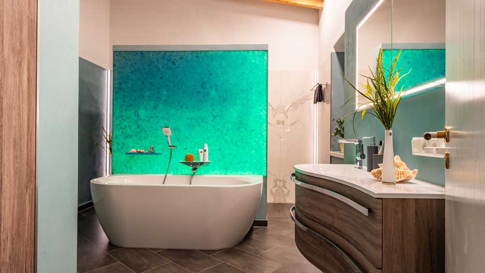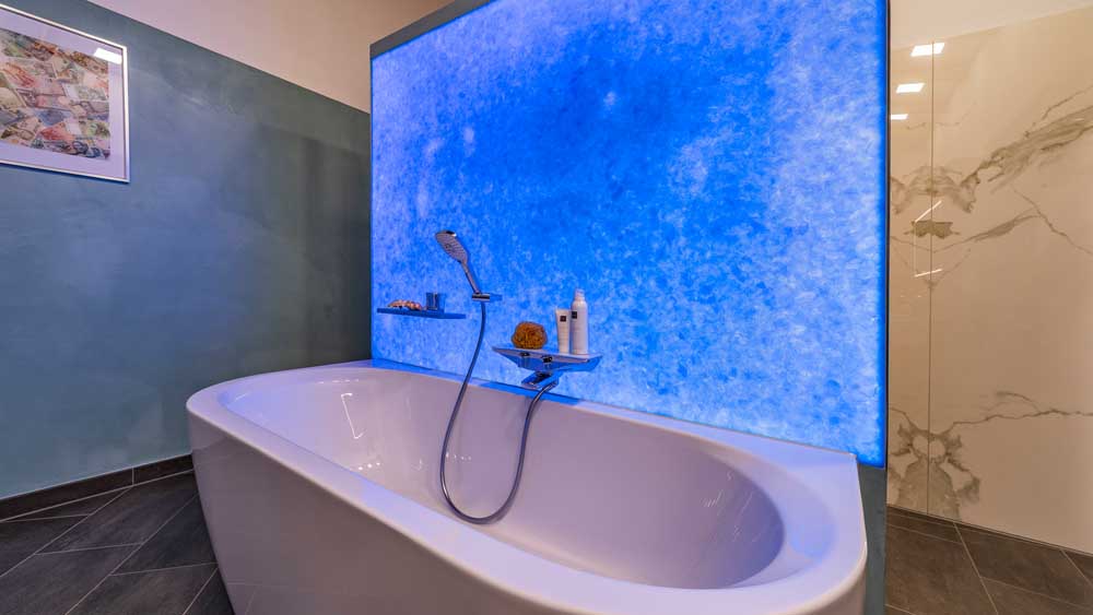 Die fugenlose Dusche sorgt für eine klare, elegante Optik und wird durch eine großzügige Kopfbrause ergänzt, die ein besonders angenehmes Duscherlebnis ermöglicht. Direkt gegenüber befindet sich die Badewanne, die durch eine Trennwand aus recyceltem Glas optisch aufgewertet wird. Verschiedene Lichtfarben schaffen hier je nach Stimmung eine entspannende oder belebende Atmosphäre.