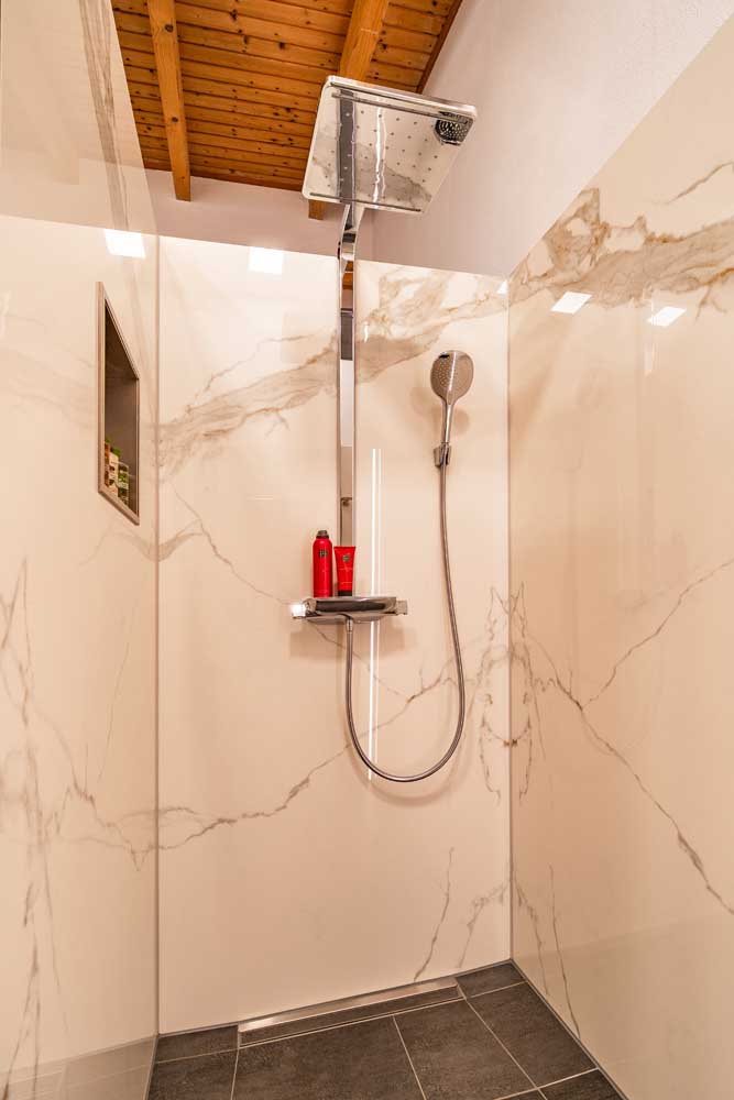 Praktisch und unauffällig zugleich ist der in die Wand integrierte Spiegelschrank, der durch zusätzlichen Stauraum ergänzt wird, ohne den Raum zu überladen. Eine moderne Infrarotheizung sorgt jederzeit für angenehme Temperaturen.