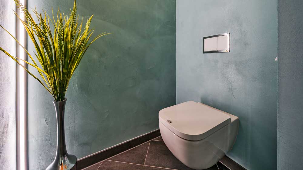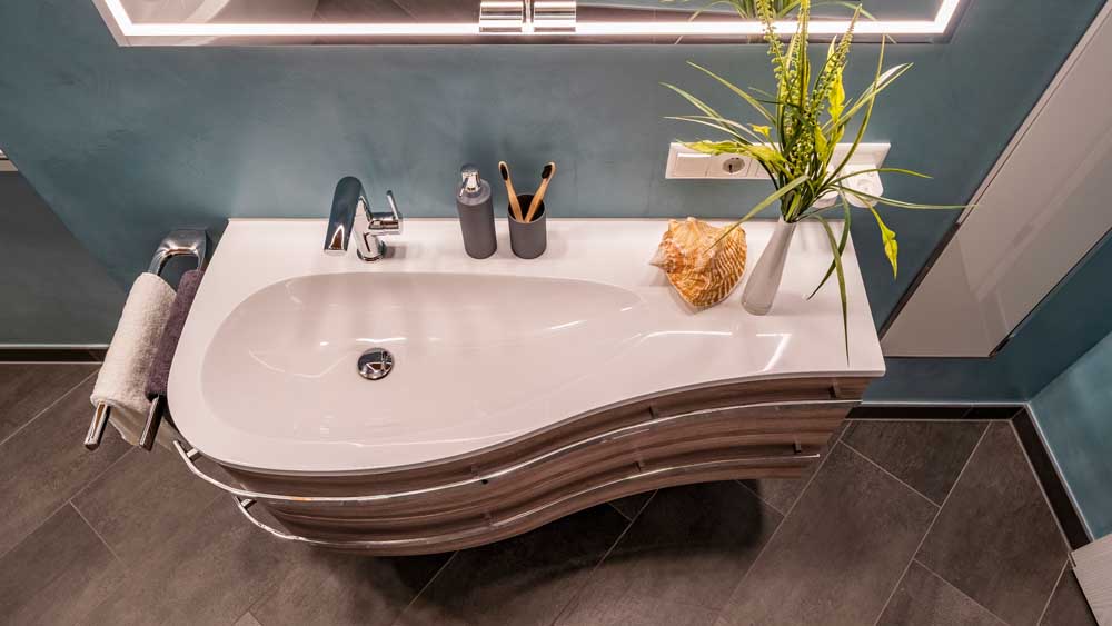 Ein besonderes Highlight dieses Bades ist die Einbau-Personenwaage, die direkt im Fußboden eingelassen wurde – ein elegantes Detail, das Komfort und Technik ideal verbindet.